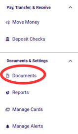 1. Log into your Charter Bank online banking. On the left side of your screen, click on Documents.