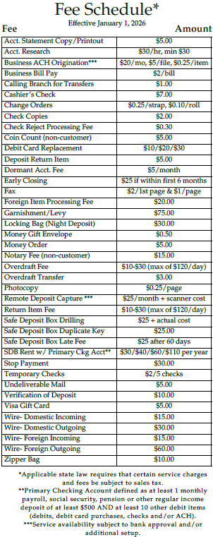 | Additional Perks | Service charge is waived for ages 24 and under. | ATM Fees are refunded up to $5 per statement cycle. Money Market rate increase available. (See rate sheet for details) | ATM Fees are refunded up to $5 per statement cycle. Money Market and Capital Account rate increase available. (See rate sheet for details) | ATM Fees are refunded up to $5 per statement cycle. Free money orders, cashier checks, 1 small Safety Deposit Box, and 1 box of standard checks per year. |